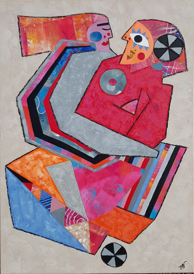 Un bel exemple de technique mixte, sur dessin cubiste : collages, pastels gras, acrylique au couteau…. par Nanie, atelier de Peschadoires.