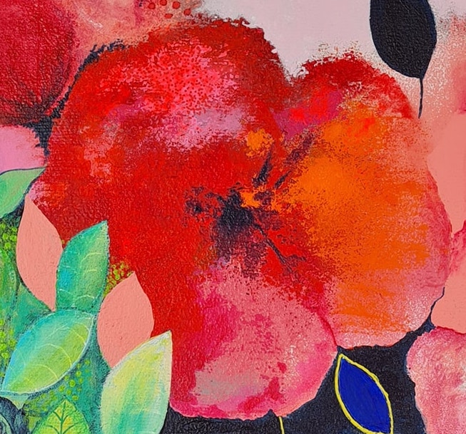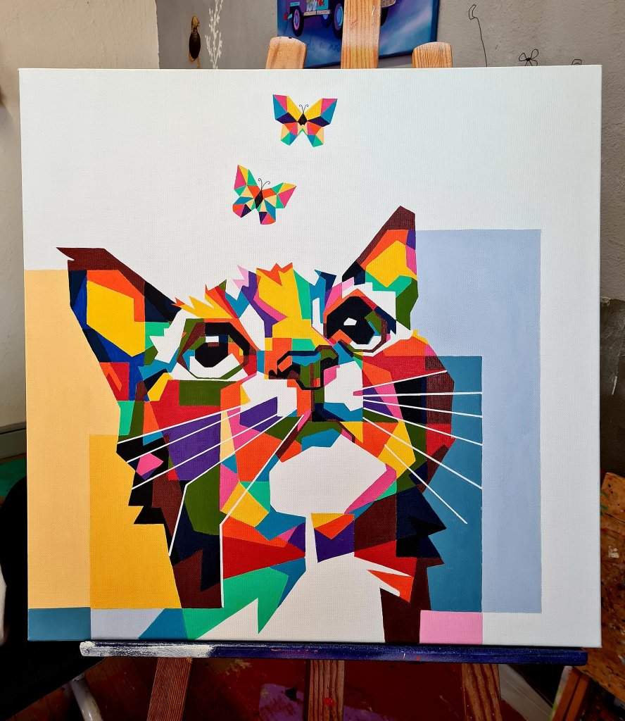Un échantillon de cette semaine avec le chat géométrique et coloré de Geneviève et cette peinture intuitive de Régine.
