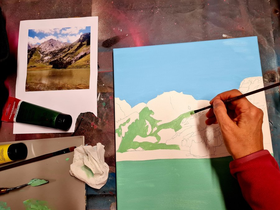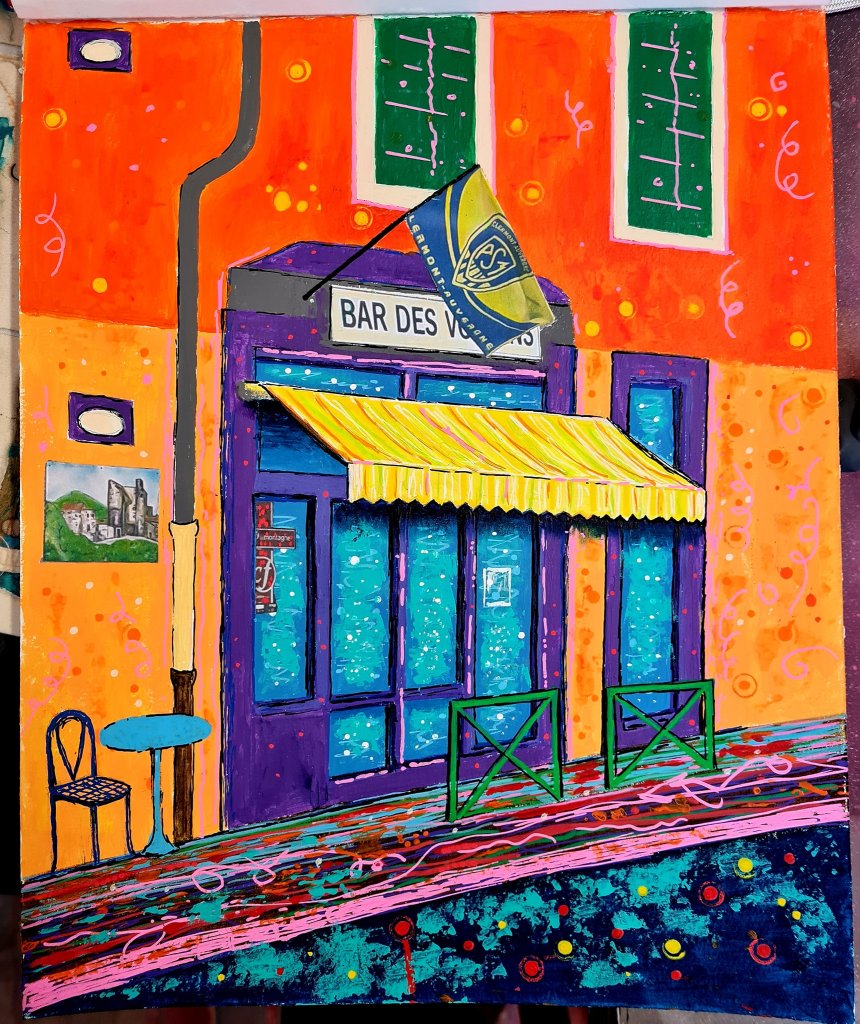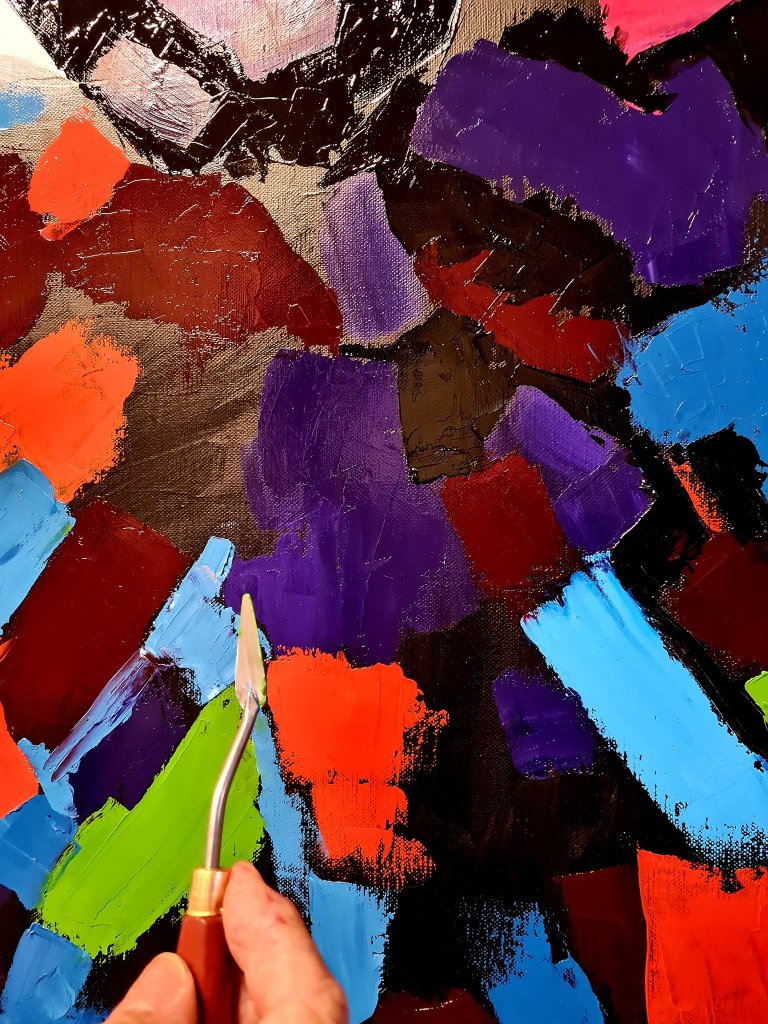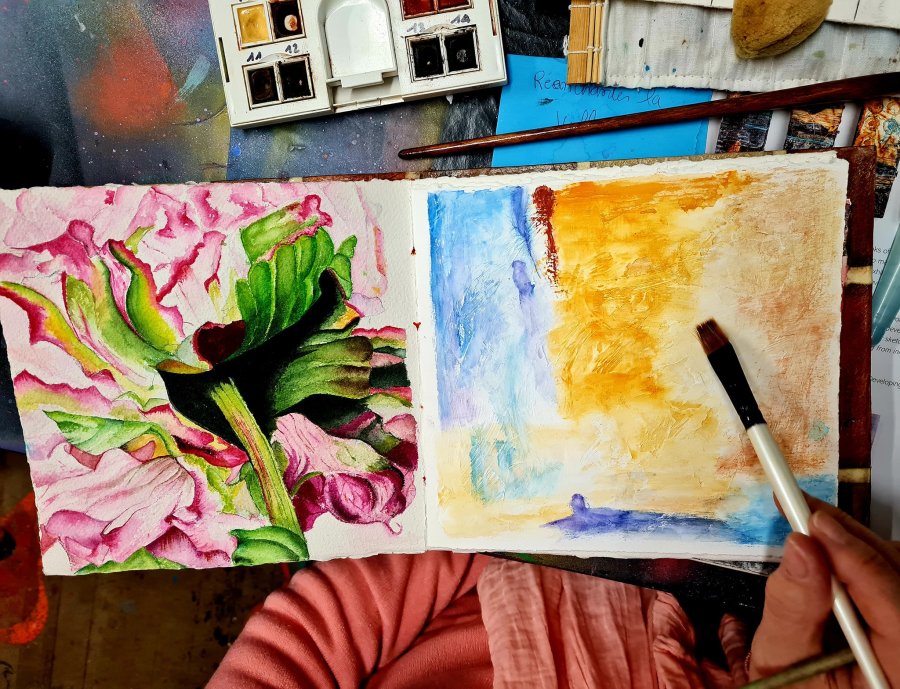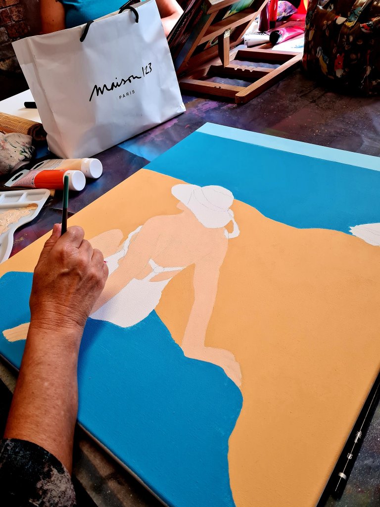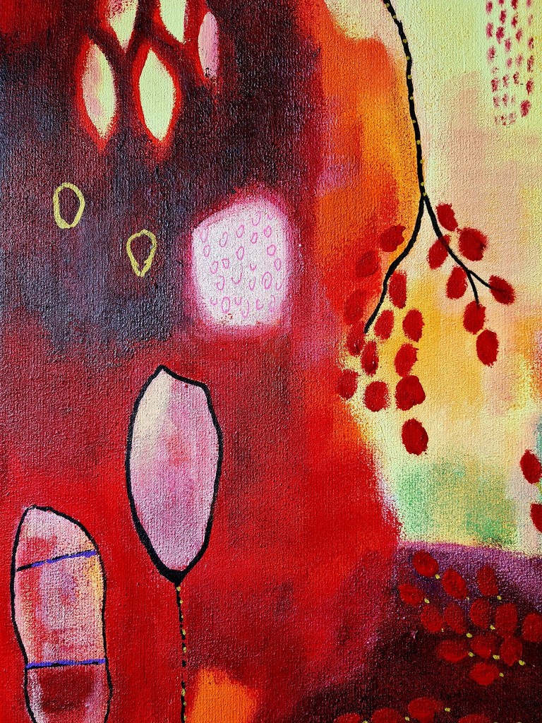 Une jolie toile d’Annie N. mélangeant un fond à l’acrylique au rouleau, et des fleurs suggérées avec de la peinture, encre de Chine et poscas.