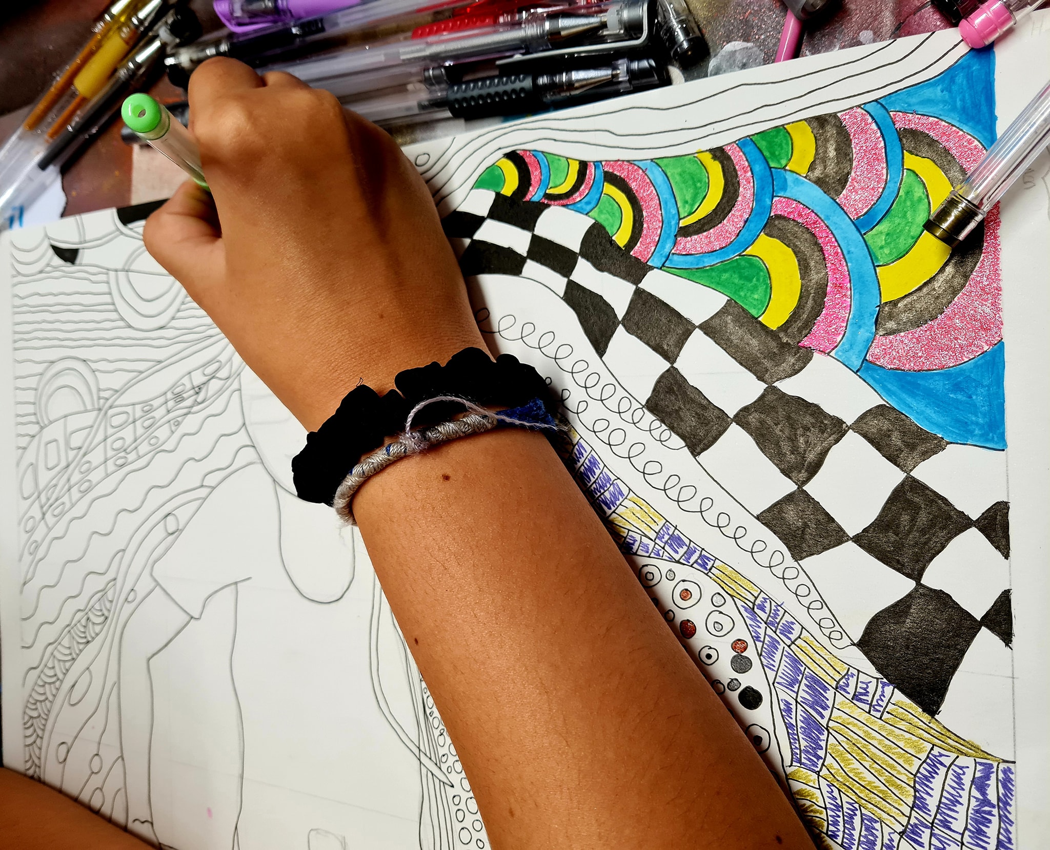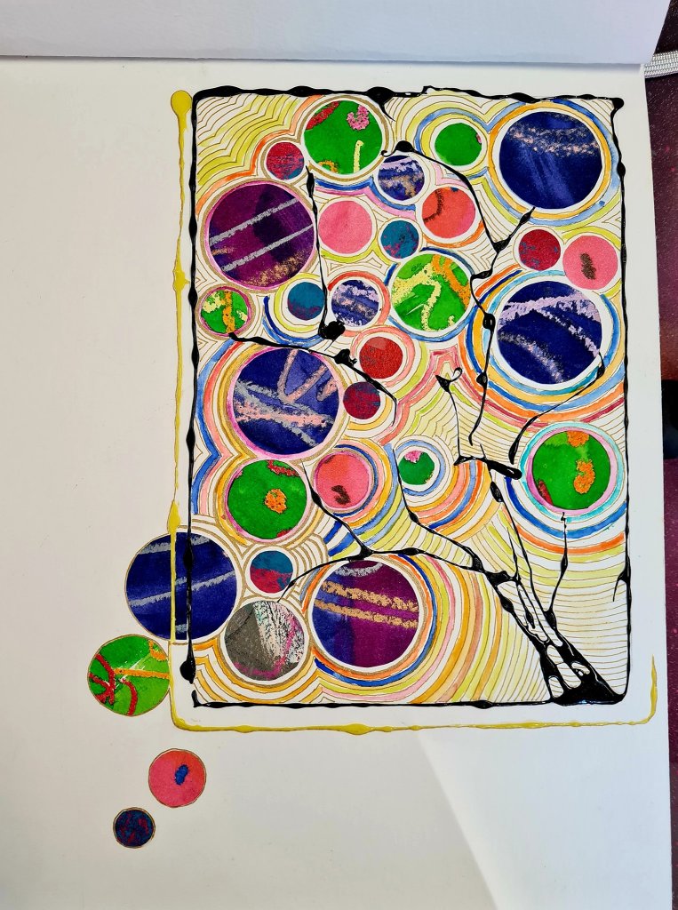 Inspiration Paul Klee en collages et encres aquarelle d’Anne Marie, et un dessin (quasi) monochrome de Nicole, les 2 terminés cet après-midi ![]()