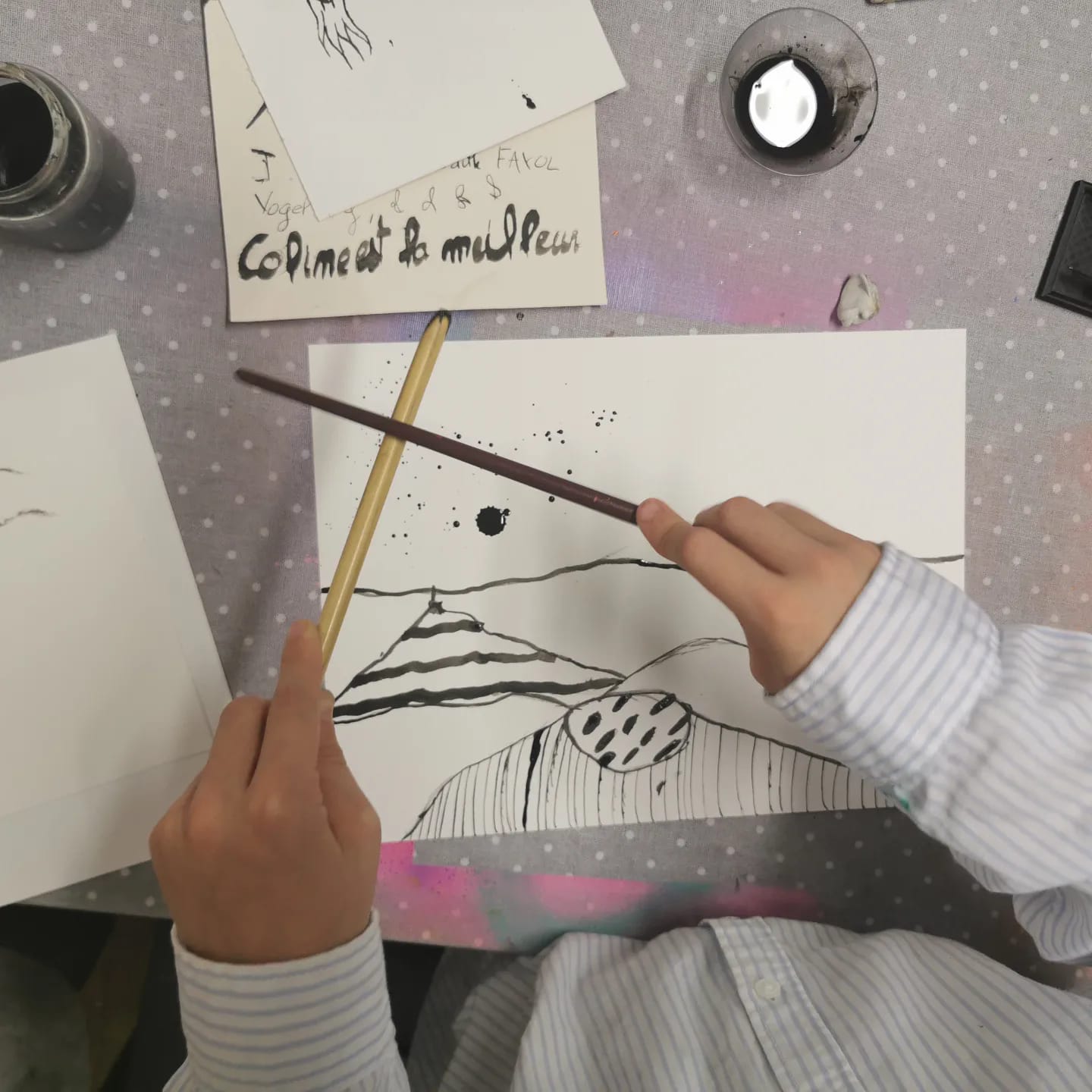 Cette semaine nous découvrons l’encre de chine au pinceau, à la plume, au calame, en projeté….