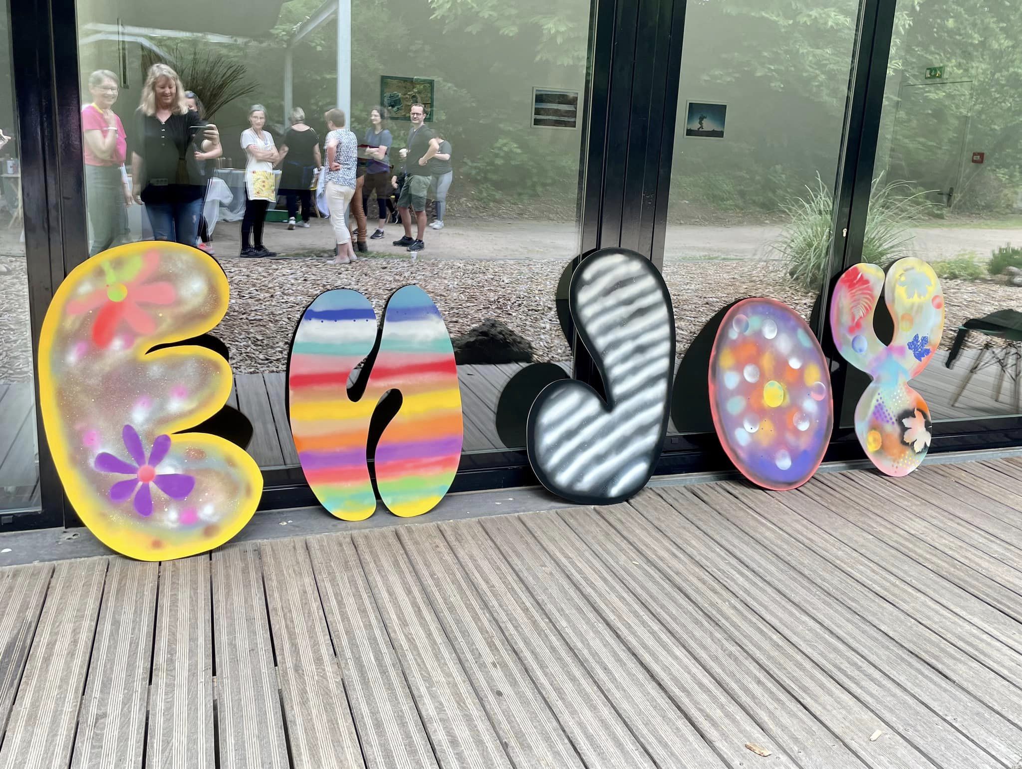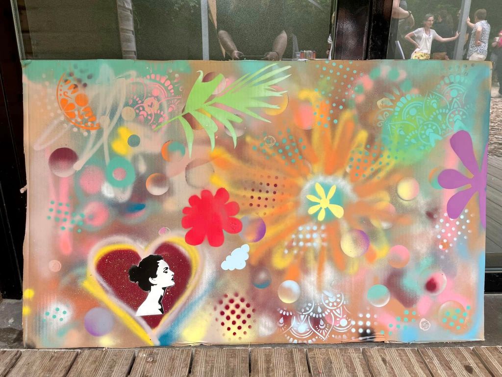 J’ai animé pour la 1ère fois un atelier de graff pour un séminaire d’entreprise, ils ont peint ces lettres Bubble sur un support en médium que j’avais préparé, et 2 cartons, le tout en collectif, c’est intense et dans une bonne ambiance, le résultat est sympa non ?
