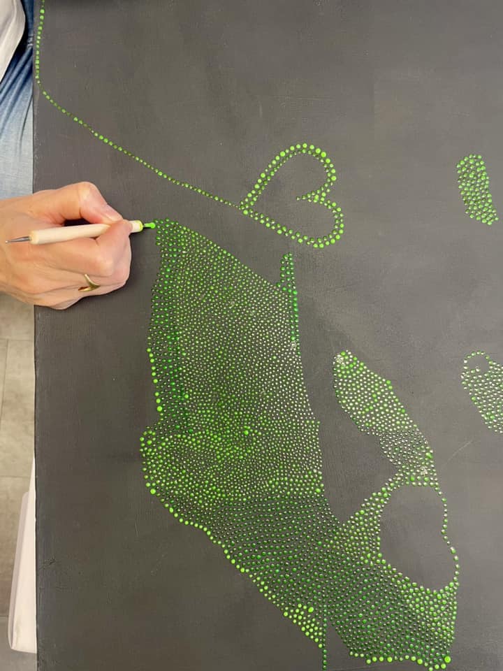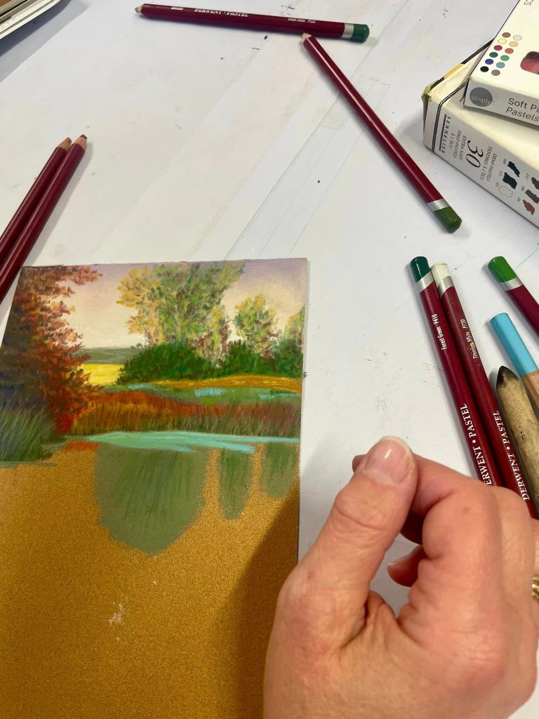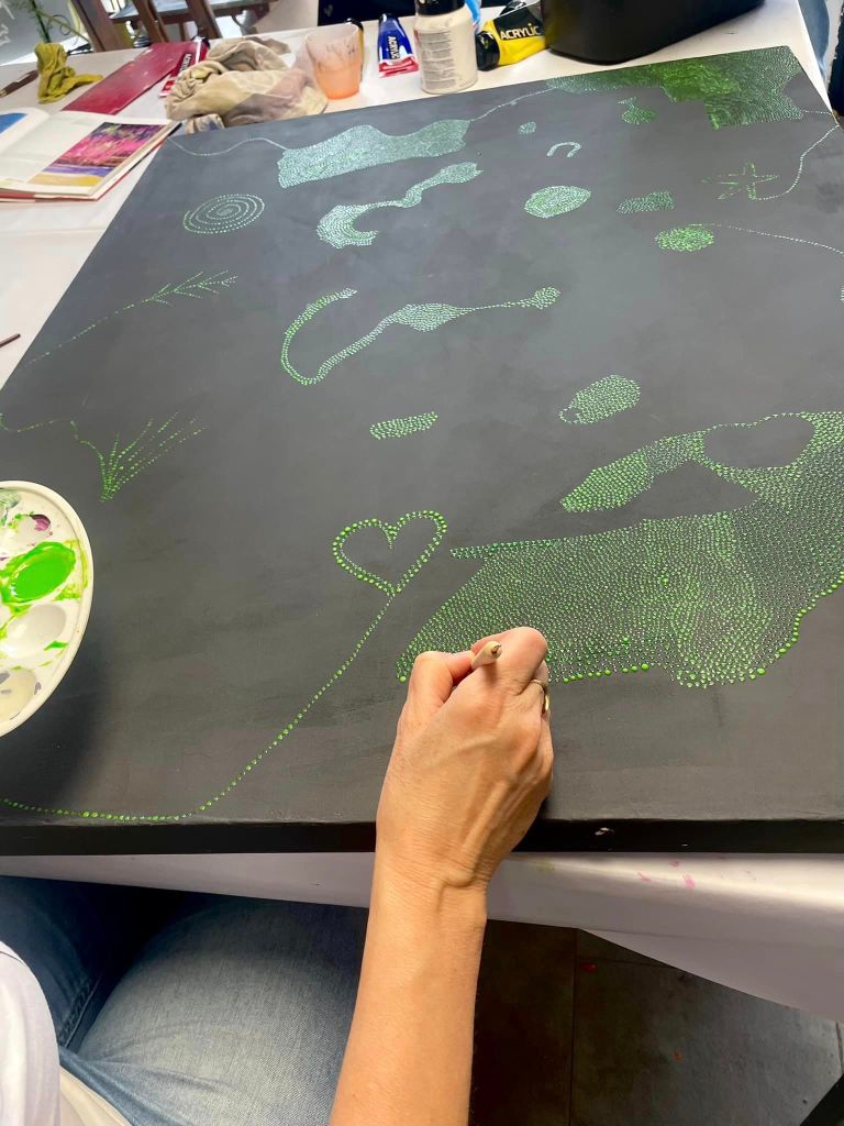 Feutres irisés sur papier noirRéalisation d’une maquette avant fresquePointillisme monochromePointillismeAcrylique au couteauPastel secFond de tableau en technique mixteLe coin de table de Cécile…