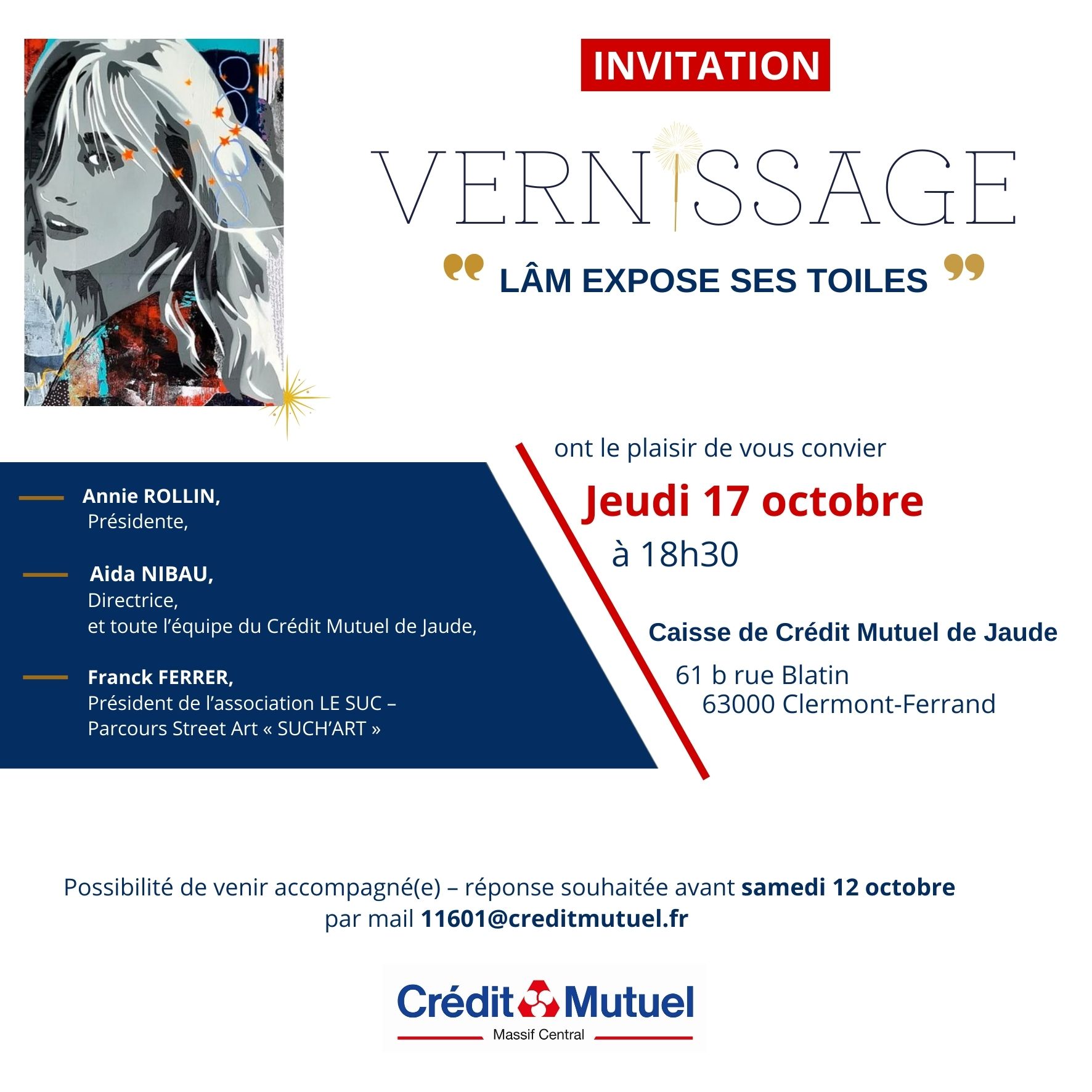 Lâm vous invite au vernissage de l’exposition de ses toiles au Crédit Mutuel rue Blatin à Clermont-Ferrand en présence de l’association Le SUC parcours Street-Art « SUCH’ART ».