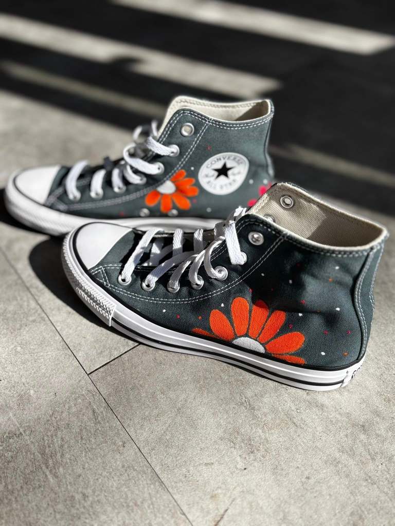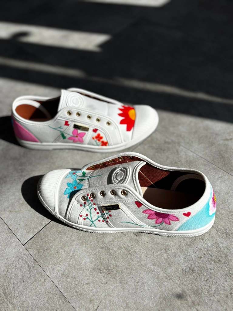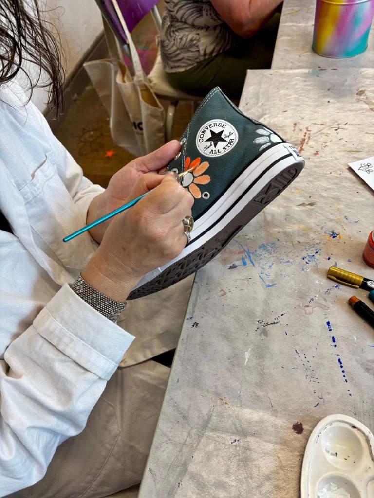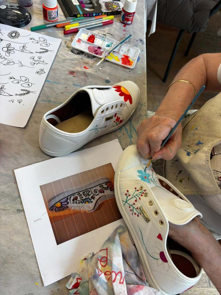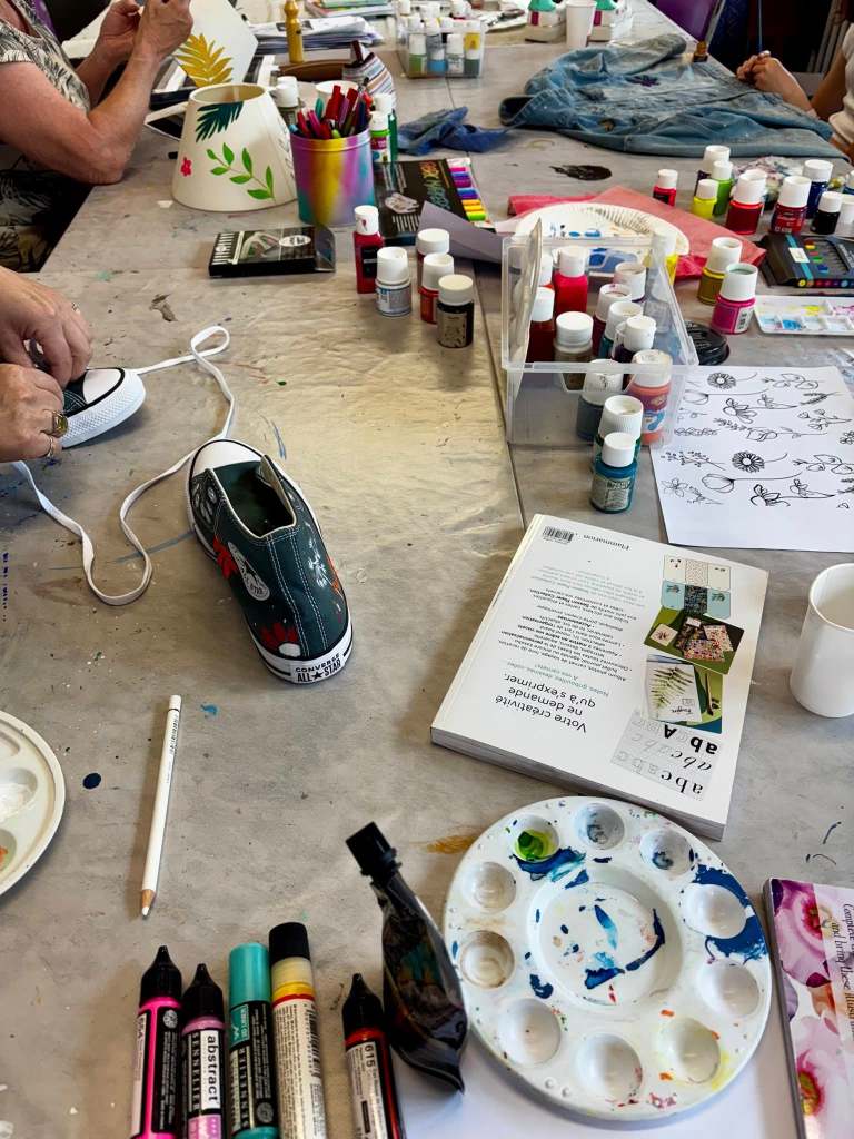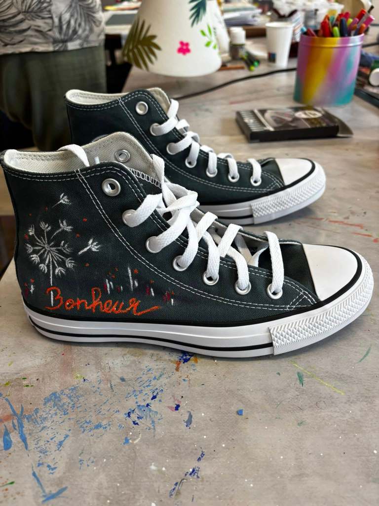Aujourd’hui c’était custom’ sur baskets tissu et cuir, teeshirt, chilienne, veste en jean, abats jours…