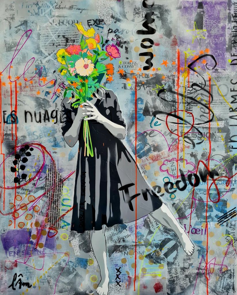Vous m’avez découvert au détour d’une rue, silhouette aperçue lors de vos promenades urbaines. Je recherche les murs tristes et délaissés pour apporter une touche de rêve et de poésie, pour semer des couleurs et faire germer un peu de gaité, peut-être un sourire.